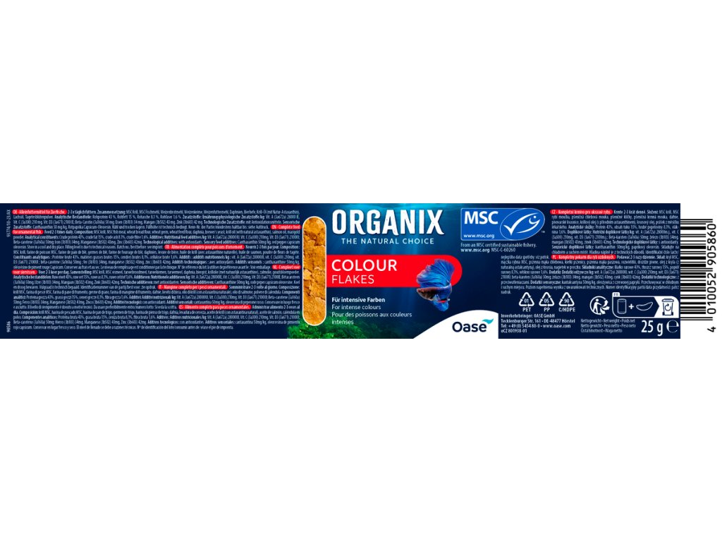 Složení: MSC krill, MSC rybí moučka, pšeničná chlebová mouka, pšeničné klíčky, pšeničná krmná mouka, dafnie, pivovarské kvasnice, krillový olej (s přírodním astaxanthinem), lososový olej, prášek z měsíčku lékařského