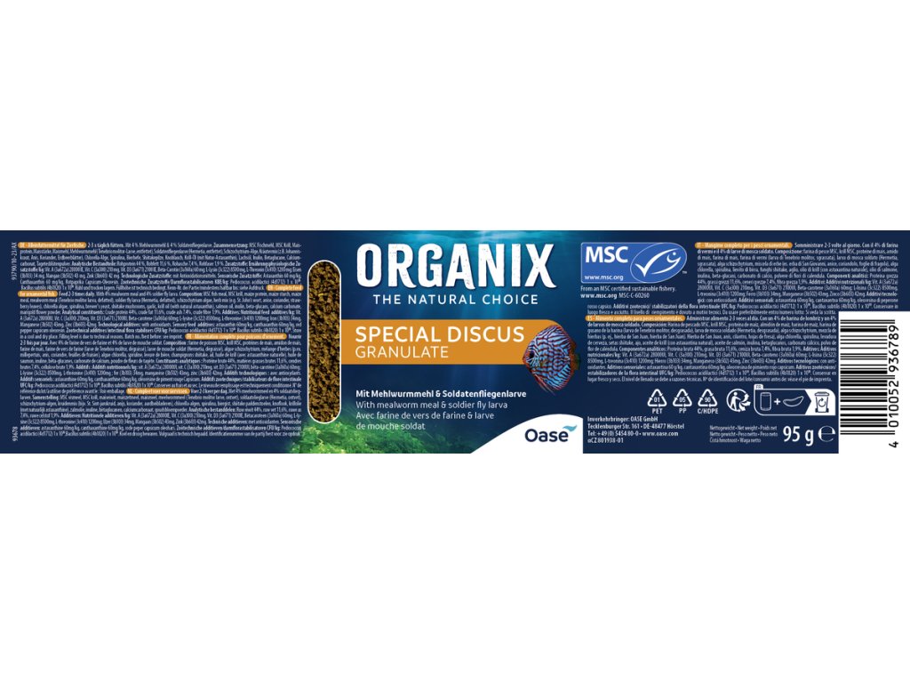 Složení: MSC rybí moučka, MSC kril, kukuřičný protein, kukuřičný škrob, kukuřičná mouka, moučka z moučných červů (larva Tenebrio molitor, odtučněná), larva černé mouchy (Hermetia, odtučněná), řasa schizochytrium, směs bylin (např. třezalka tečkovaná, anýz, koriandr, list jahodníku), řasa chlorella, spirulina, pivovarské kvasnice, houby shiitake, česnek, krilový olej (s přírodním astaxanthinem), lososový olej, inulin, betaglukan, uhličitan vápenatý, prášek z květů aksamitníku. Analytické složky: Hrubý protein 44 %, hrubý tuk 11,6 %, hrubý popel 7,4 %, hrubá vláknina 1,9 %. Přídavné látky: Nutričně-fyziologické přídavné látky / kg: Vit. A (3a672a) 28 000 IE, Vit. C (3a300) 210 mg, Vit. D3 (3a671) 2 100 IE, betakaroten (3a160a) 60 mg; L-lysin (3c322) 8 500 mg, L-threonin (3c410) 1 200 mg; železo (3b103) 34 mg, mangan (3b502) 43 mg, zinek (3b603) 42 mg. Technologické přídavné látky: s antioxidačními prostředky. Senzorické přídavné látky: astaxanthin 60 mg/kg, canthaxanthin 60 mg/kg, červená paprika (pryskyřice paprik rodu Capsicum). Zootechnické přídavné látky / stabilizátory střevní mikroflóry KBE/kg: Pediococcus acidilactici (4d1712) 1x 1010, Bacillus subtilis (4b1820) 1x 1010.