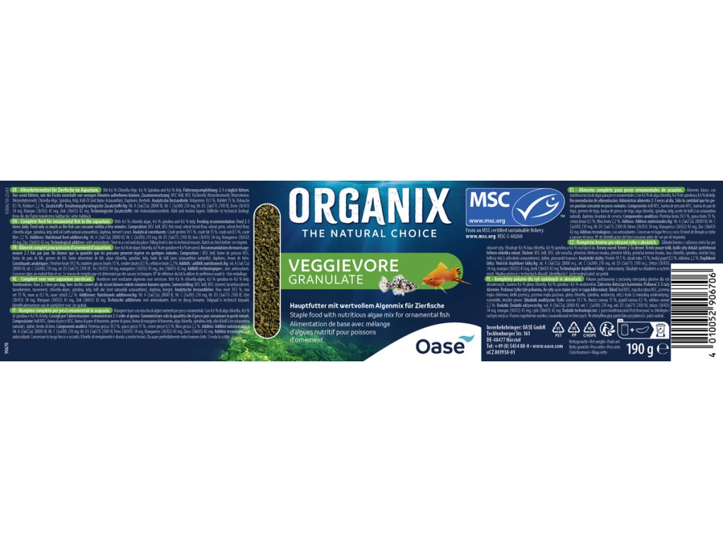 Složení: MSC krill, MSC rybí moučka, pšeničná chlebová mouka, pšeničné klíčky, pšeničná krmná mouka, řasa chlorella, spirulina, mořské řasy, krillový olej (s přírodním astaxantinem), dafnie, pivovarské kvasnice. Analytické složky: Protein 39,5%, obsah tuku 15%, hrubý popel 8,5%, vláknina 2,2%. Doplňkové látky: Nutriční doplňkové látky/kg: vit. A (3a672a) 28000m.j., vit. C (3a300) 210mg, vit. D3 (3a671) 2100m.j.; železo (3b103) 34mg, mangan (3b502) 43mg, zinek (3b603) 42mg. Technologické doplňkové látky: s antioxidanty.