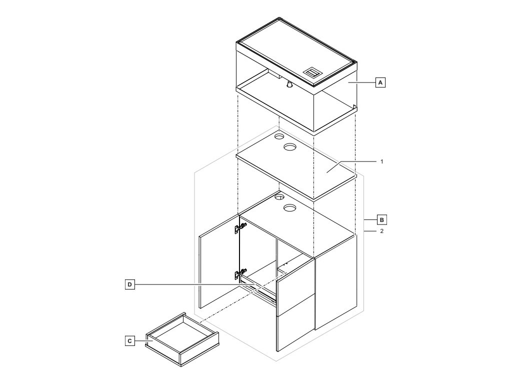 - K dispozici je 6 velikostí, 4 provedení spodní skříňky a také koordinovaná řešení filtrů a svítidel, které lze individuálně konfigurovat