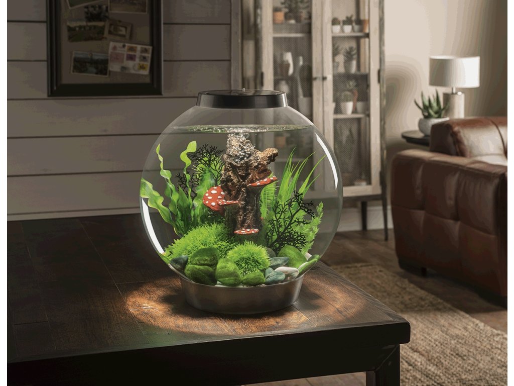 - Hlavní součástí je menší dekorativní akvárium v černém provedení na 30 litrů v klasickém kulatém tvaru