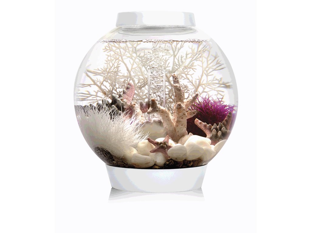 - Hlavní součástí je větší dekorativní akvárium v bílém provedení na 60 litrů v klasickém kulatém tvaru