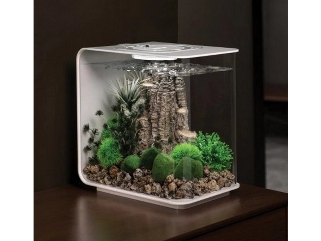 - Hlavní součástí je malé dekorativní akvárium s bílým rámem na 15 litrů