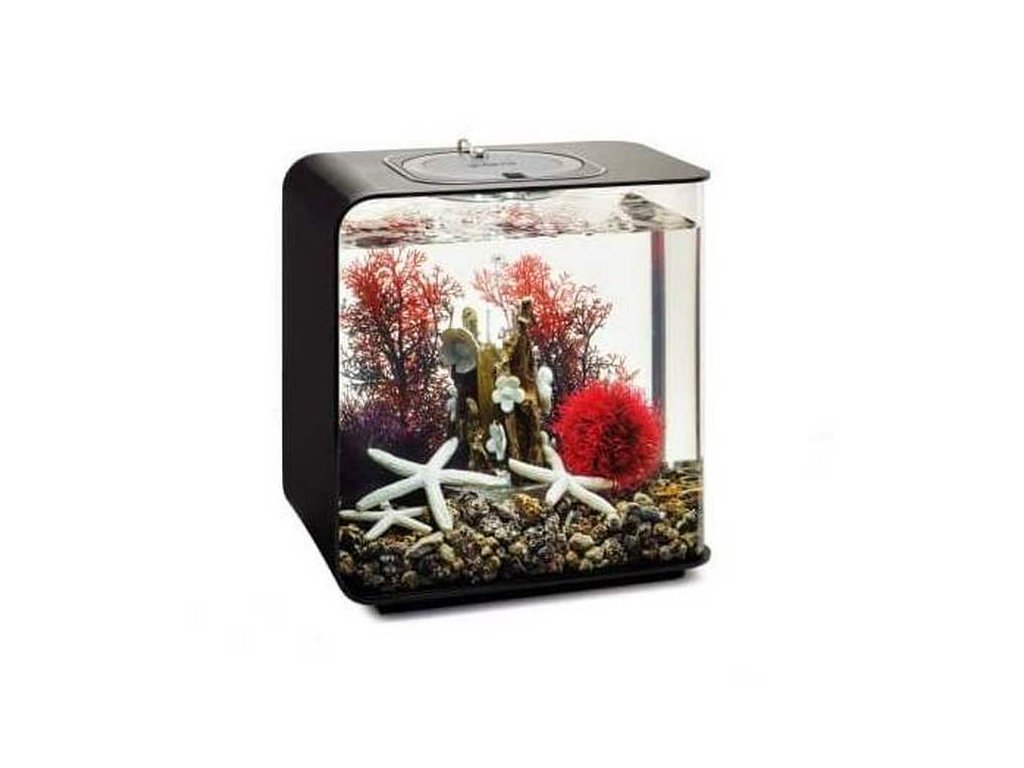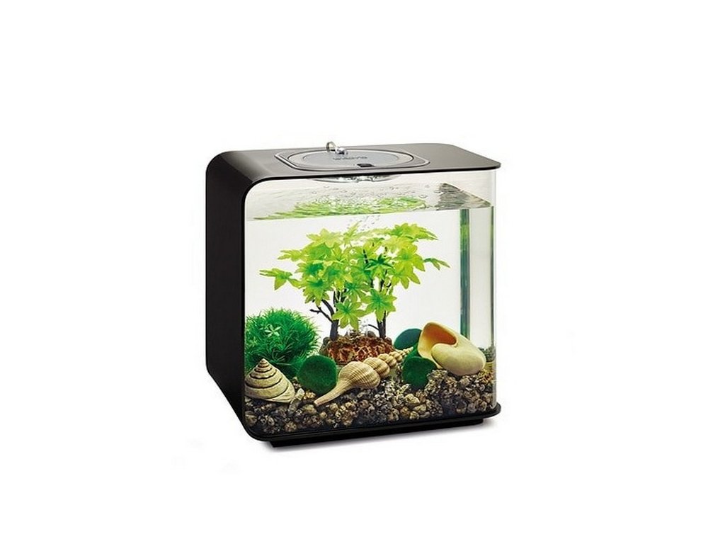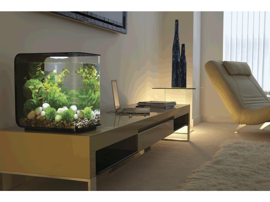 - Hlavní součástí je malé dekorativní akvárium s černým rámem na 15 litrů