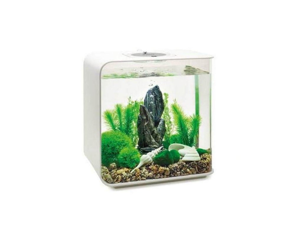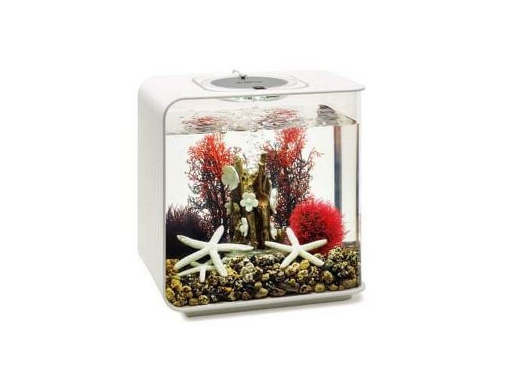 - Hlavní součástí je středně velké dekorativní akvárium s bílým rámem na 30 litrů