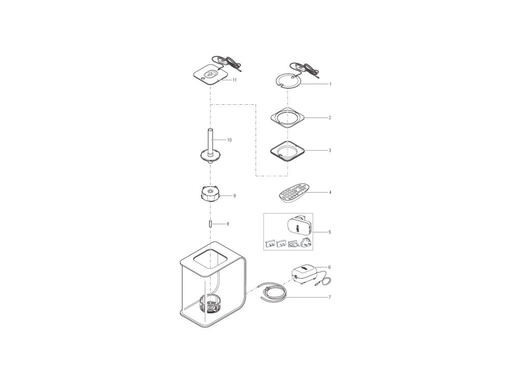 - Skládá se z akrylátového akvária, jednotky osvětlení, čerpadla, transformátoru, provzdušňovacího kamene, filtrační náplně a keramického dna
