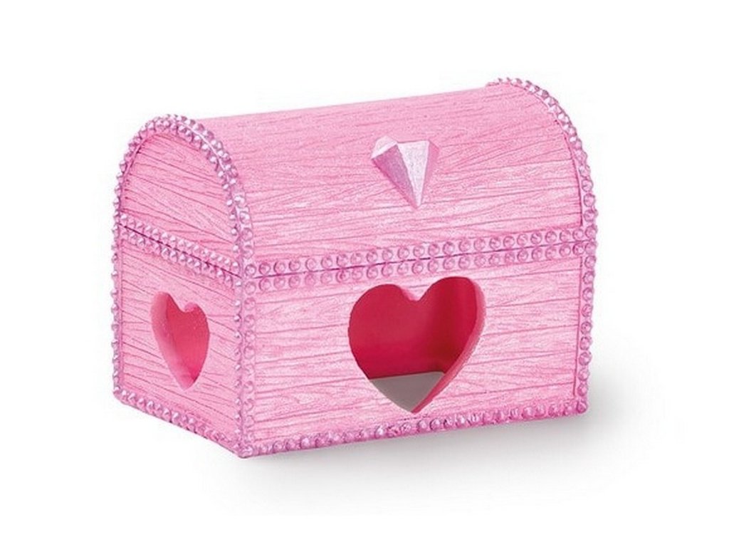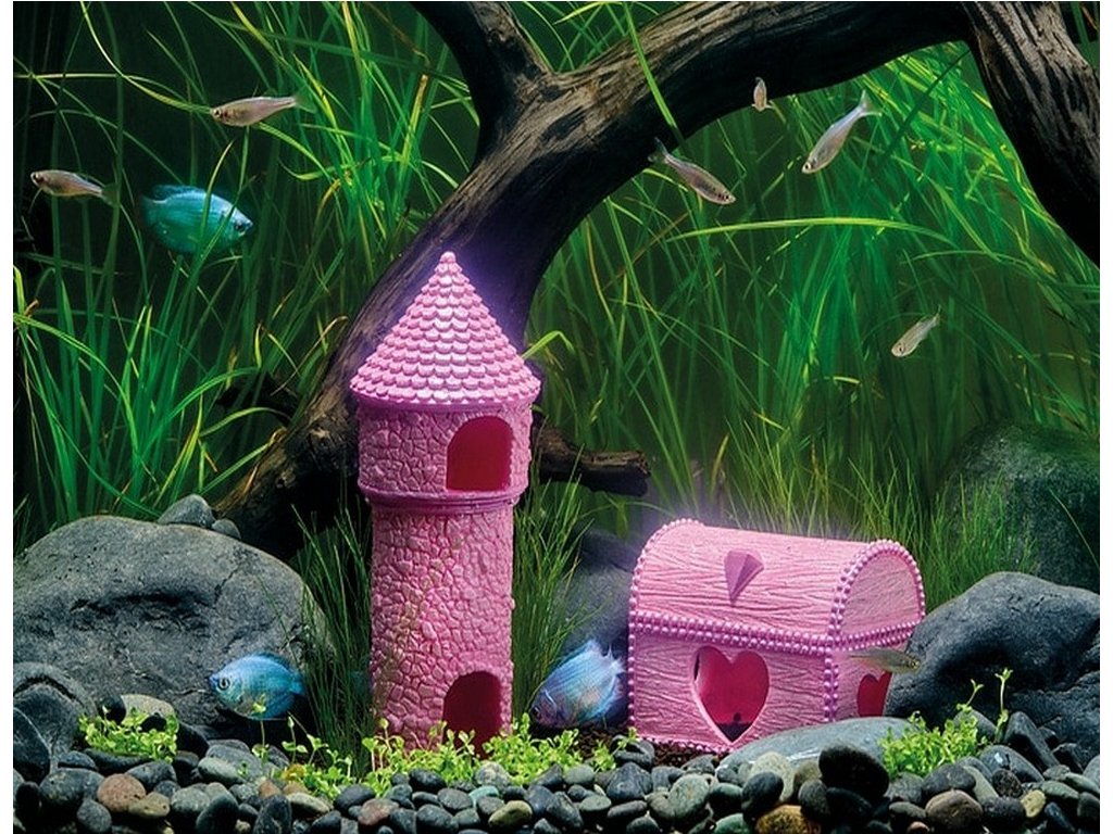 - Detailní vzhled truhly v růžové barvě s fialovými akcenty je zakončen třpytivým diamantem a dodává akváriu nádech kouzla