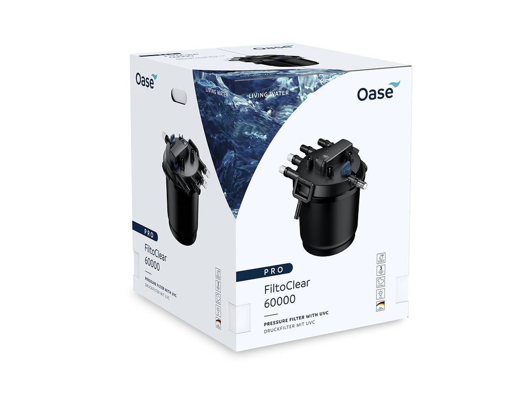 - Vestavěná bypass technologie OASE zajišťuje optimální průtok vody a chrání před zanesením filtru