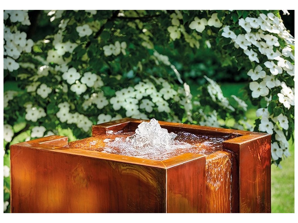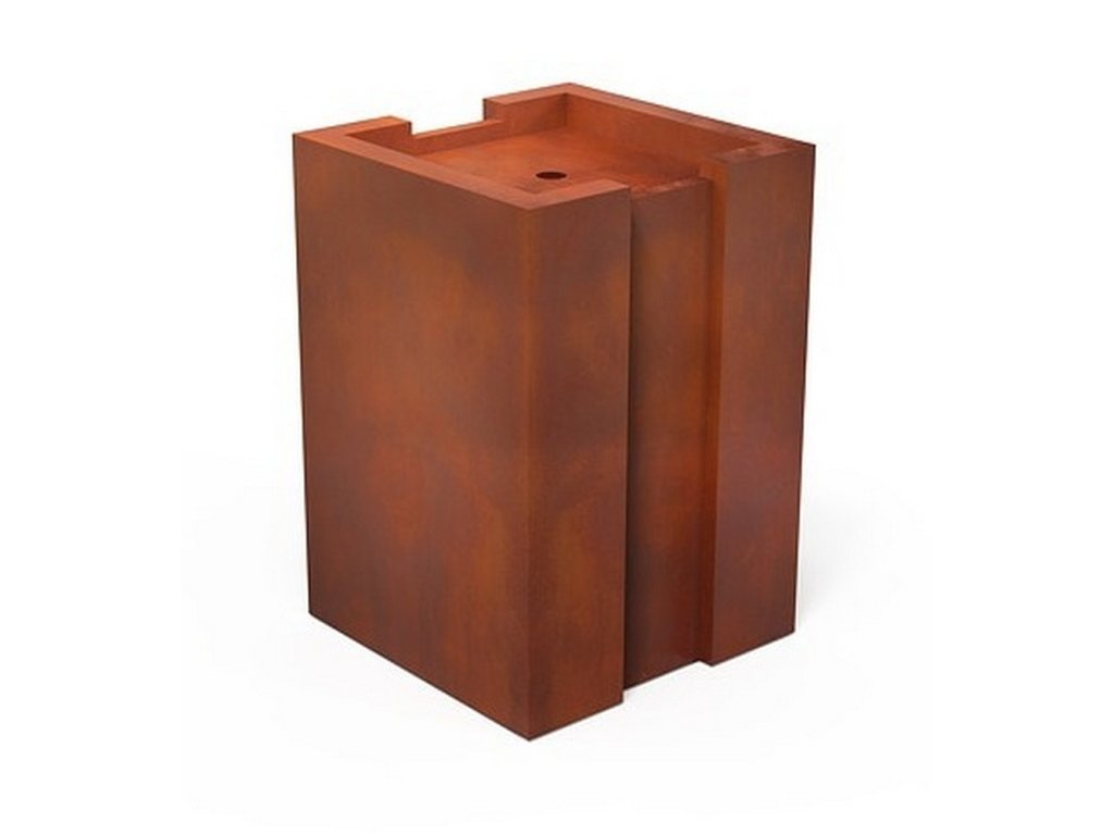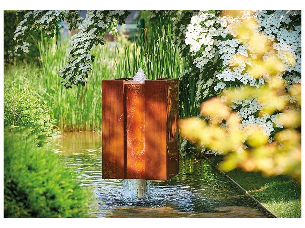 - Vodní prvek Cube 90 CS v podobě kostky s výraznými rohy a hranami vyrobený z klasické oceli Corten *1