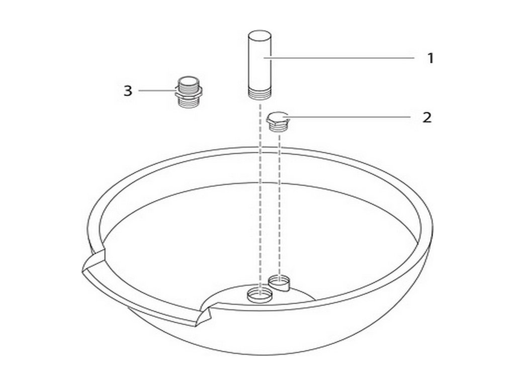- Přívod vody a průchodka pro kabel osvětlení (obojí o rozměru 1 ½") jsou uloženy na dně mísy, zvenčí nejsou vidět